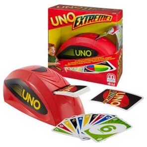 Uno Extrem mit Kartenwerfer und exklusiver Extreme Karte. Drückt man auf den Kartenwerfer passiert mit Glück nichts. Hat man Pech spuckt er eine wahre Flut von Karten aus.